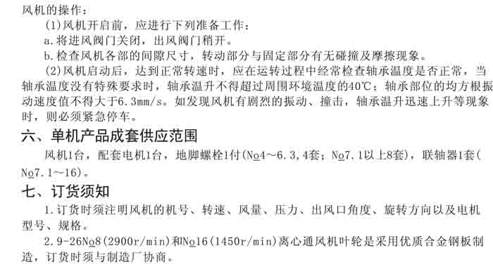 一、風(fēng)機(jī)選用參考、安裝維護(hù)使用說明、常見故障分析、訂貨注意事項(xiàng)